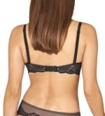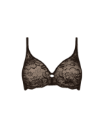 Przeźroczysty tiul oraz koronka z kwiatowym motywem pięknie zdobi miseczki biustonosza