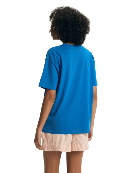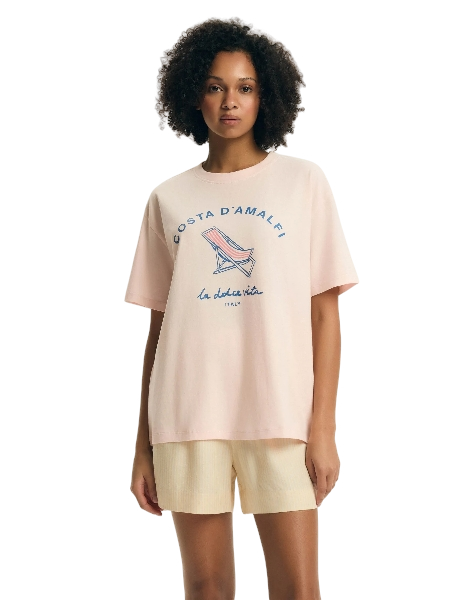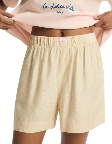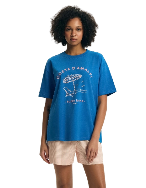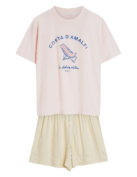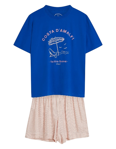 Piżama damska Henderson 44479 Edris to wygodny i stylowy komplet idealny na ciepłe noce. Składa się z koszulki z krótkim rękawem oraz krótkich spodenek, zapewniając komfort i swobodę ruchów podczas snu i odpoczynku w domu. Górna część wykonana jest z miękkiej, oddychającej bawełny, posiada okrągły dekolt oraz modny nadruk, który nadaje jej letniego charakteru. Szorty uszyto z lekkiej i przewiewnej wiskozy, wyróżniają się paskowanym wzorem oraz elastyczną gumką w pasie, dzięki czemu dobrze dopasowują się do sylwetki.